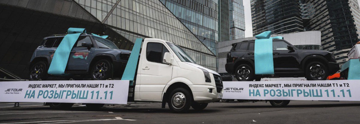 Во второй половине октября у одного из дилерских центров JETOUR в Москве появились несколько автомобилей, оформленных в красные чехлы, с предложением от Яндекс Маркета разыграть эти авто 11 ноября, в день Распродажи. Вызов был принят! Вскоре к офису Яндекс Маркета прибыли автовозы, на платформах которых стояли автомобили, украшенные нарядными подарочными лентами. Это были завоевавший огромную популярность на российском рынке кроссовер повышенной проходимости JETOUR T2 и дебютировавший в сентябре 2025 года кроссовер JETOUR T1.