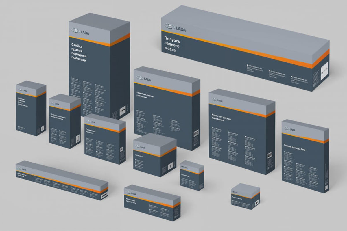 В настоящее время в каталоге запчастей LADA – более 1300 изделий, для которых предусмотрена индивидуальная упаковка: это детали для двигателя, трансмиссии, ходовой части, системы управления, электрооборудования, кузовные детали, ремонтные комплекты и технические жидкости. На каждой коробке указывается каталожный номер запчасти, ее применяемость, фотография изделия, дополнительные характеристики. В качестве гарантии подлинности и качества предусмотрен защитный голографический стикер и наклейка с указанием номера запасной части. Согласно стандартам LADA, упаковка выполнена в двух основных цветах – светло-сером и темно-сером. Они разделены оранжевой восходящей линией, которая является частью всех коммуникаций LADA и символизирует слоган марки – «LADA. Новые горизонты». Более подробно о фирменной упаковке и о способах защиты оригинальных запчастей от подделки можно прочитать по ссылке.