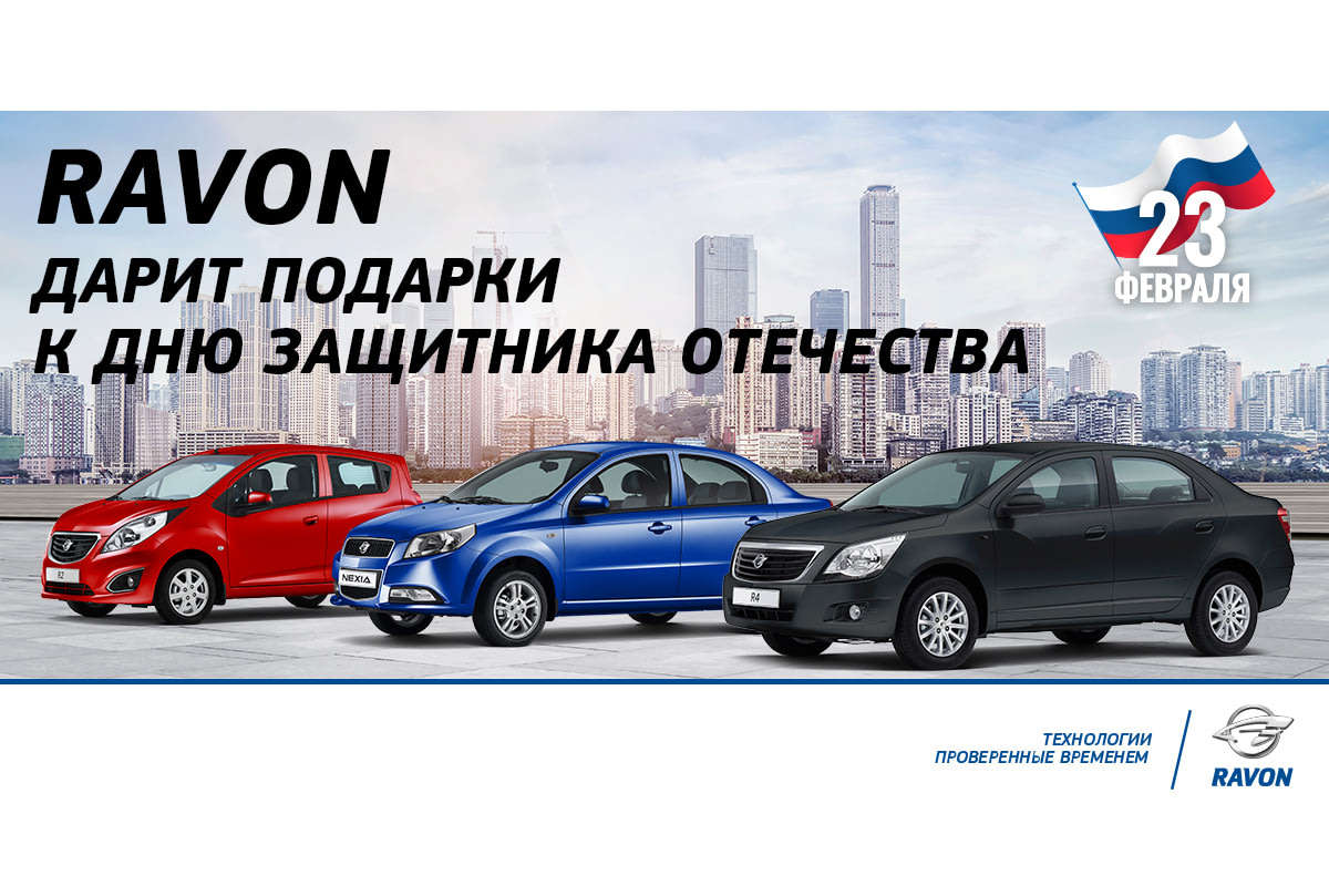 Мы поздравляем всех наших покупателей с Днем защитника Отечества и в честь этого праздника дарим каждому мужчине, совершившему покупку в сети салонов RAVON в период с 21 по 29 февраля, сертификат на ценные подарки. Покупателю предоставляется право выбрать нужный ему подарок: набор автомобилиста и коврики или видеорегистратор.