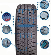 7. "Стреловидные ламели" плечевой зоны улучшают сцепление при движении по заснеженной дороге.
